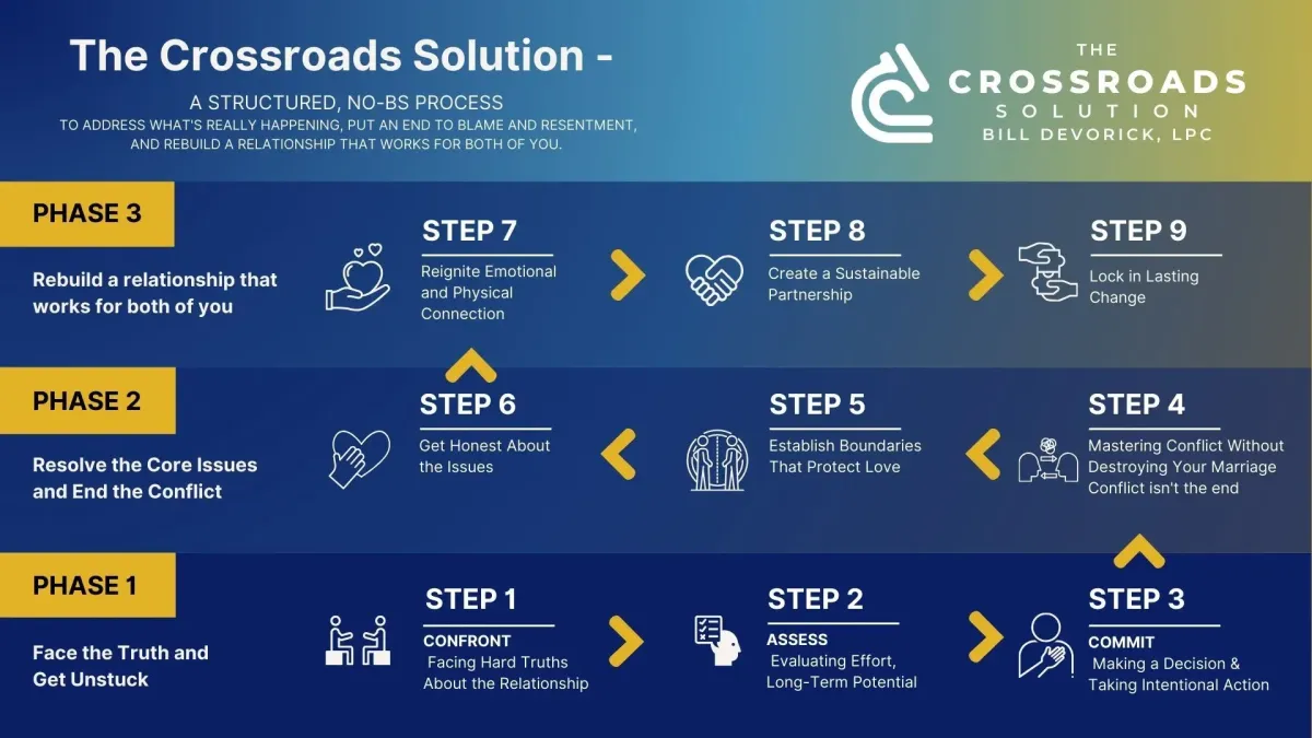 The Crossroads Solution is a no-BS process that helps you face what’s really going on, get honest about what needs to change, and rebuild a relationship that actually works for both of you—or move on with clarity and peace of mind.